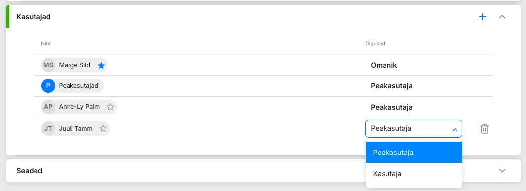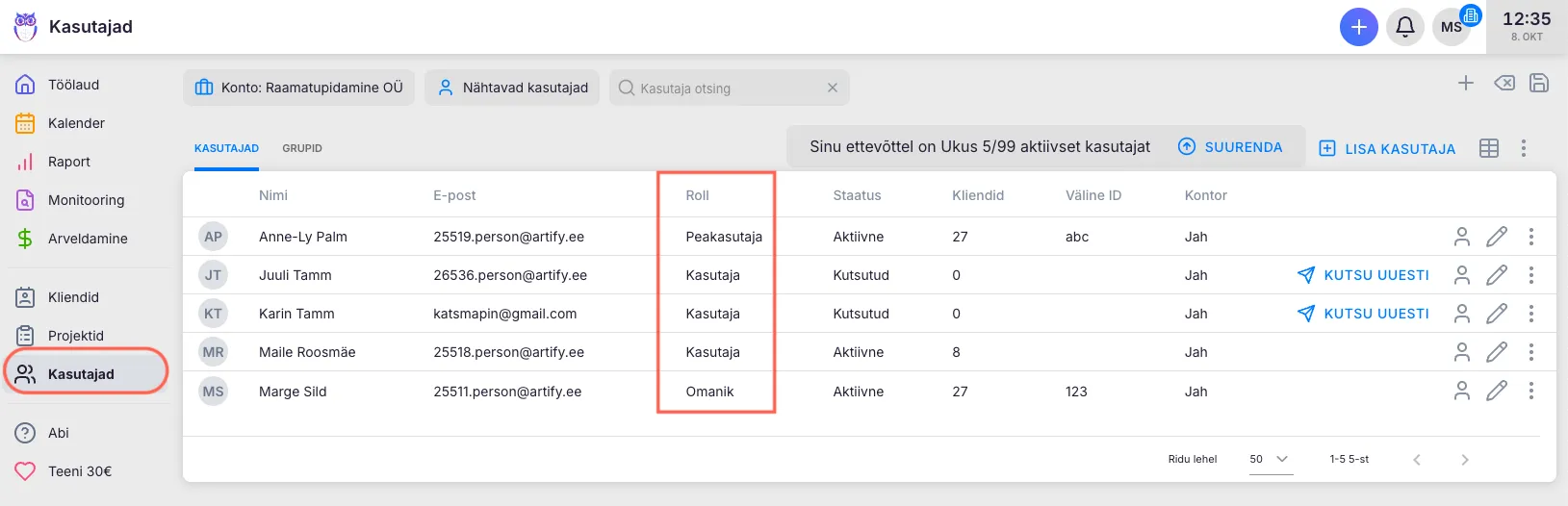 - Vaata veergu „Roll“ (Omanik / Peakasutaja / Kasutaja)