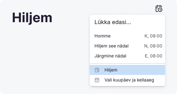Töölaud: Hiljem – Lükka ülesanded “Hiljem” vaatesse, kui pole kindel, millal nendega tegeled. Näide: ootad kliendilt vastust ja ei taha seda tänases listis näha? Pane “Hiljem” ja keskendu olulisemale.