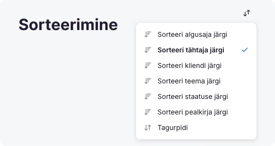 - Töölaud: Sorteerimine – Töölauda saab nüüd sortida alguskuupäeva, tähtaja, kliendi, staatuse, teema, pealkirja või lõpetatuse järgi – ja vajadusel ka järjekorda pöörata.