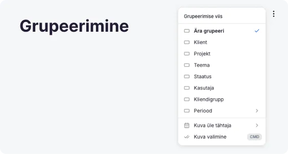 Section titled “Täiustused”- Töölaud: Grupeerimine – Ülesandeid saab grupeerida kliendi, teema, kliendirühma, staatuse, perioodi, projekti või liikme järgi. Gruppidega saad teha ka mass-toiminguid!