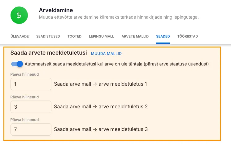 Arveldamine: Saada automaatselt meeldetuletusi maksmata arvete kohta Seadista kuni 3 meeldetuletust Arveldamise seadetes, korda nende saatmise päevi (nt 1, 3 ja 7 päeva pärast tähtaega), kohanda ekirjade sisu ning lülita soovi korral kliendi tasemel meeldetuletused välja. Kui päevade arv on 0 või täitmata, ekirja ei saadeta.