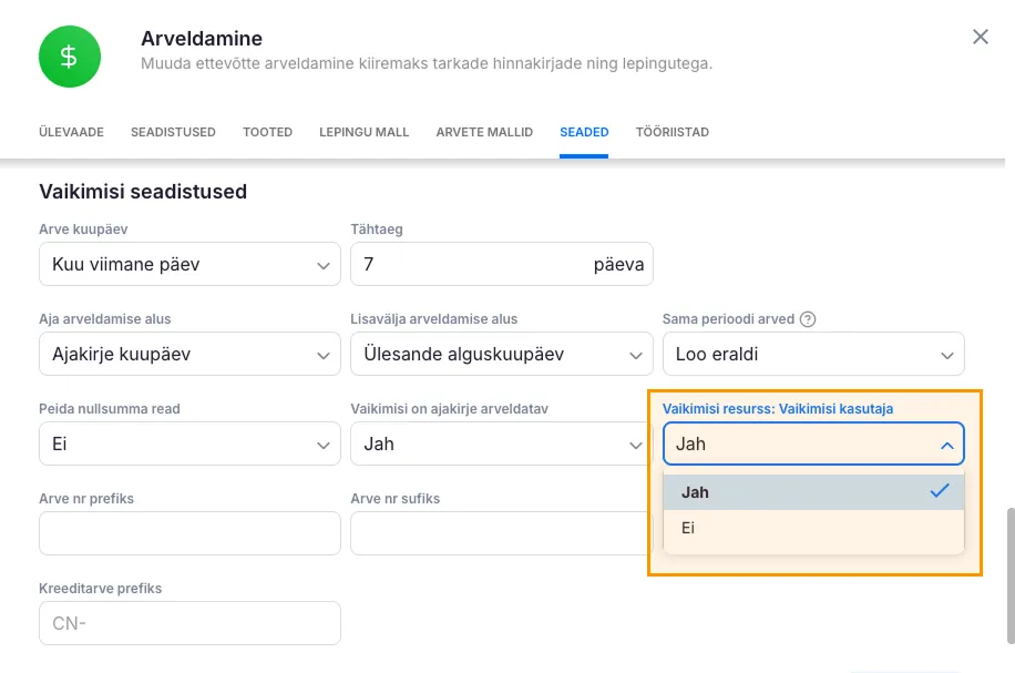 Arveldamine: Vali ettevõtte seadetes kliendi “Vaikimisi kasutaja” arvelduse vaikimisi ressursiks Ressurssi saab Ukus määrata 5 tasemel (1. Arve rea, 2. Lepingu teenuse, 3. Toote, 4. Kliendi vaikimisi 5. Ettevõtte vaikimisi) Näide: Suuna vaikimisi konsultatsioonitunnid kliendi raamatupidajale (“Vaikimisi kasutaja”), kuid tarkvara litsentsid seosta eraldi ressursiga, mis on määratud toote tasemel.